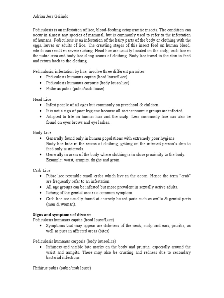 of humans. Pediculosis is an infestation of the hairy parts of the body or clothing with the