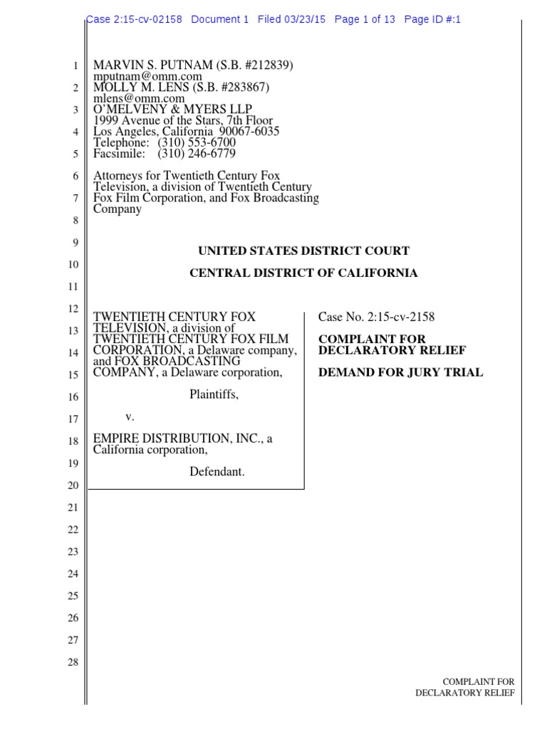 Plaintiffs Twentieth Century Fox Television (“TCFTV”), a division of Twentieth Century Fox Film Corporation (“TCFFC”), and Fox Broadcasting Company (“FBC”) (collectively, “Fox”), for their complaint against defendant Empire Distribution, Inc., allege as follows: