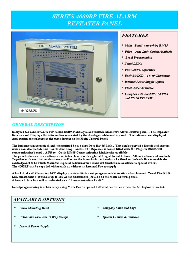Designed for connection to our Series 4000MP analogue addressable Main Fire Alarm control panel . The Repeater