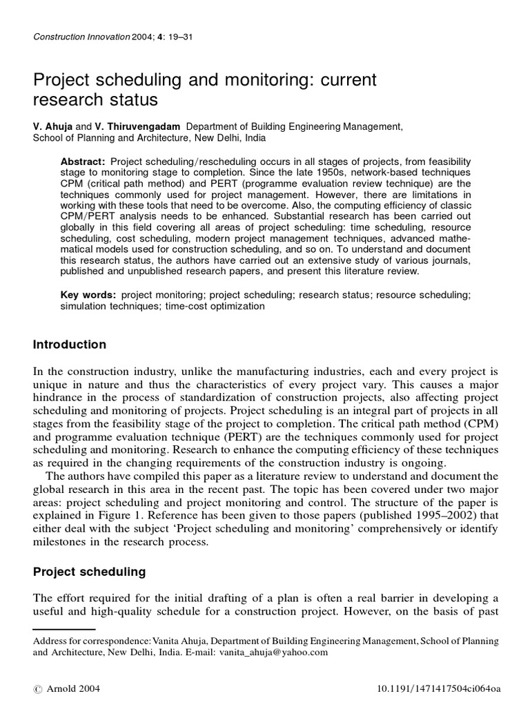 scheduling, cost scheduling, modern project management techniques, advanced mathematical models used for construction scheduling, and so on. To understand and document