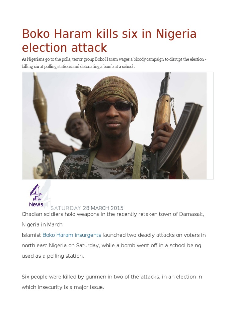 As Nigerians go to the polls, terror group Boko Haram wages a bloody campaign to disrupt the election killing six at polling stations and detonating a bomb at a school.