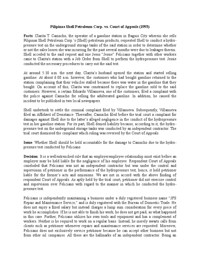 Pilipinas Shell Petroleum Corp.s (Shell) petroleum products, requested Shell to conduct a hydropressure test on the underground storage tanks of the said station in order to determine whether