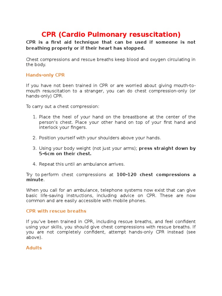 If you have not been trained in CPR or are worried about giving mouth-tomouth resuscitation to a stranger, you can do chest compression-only (or