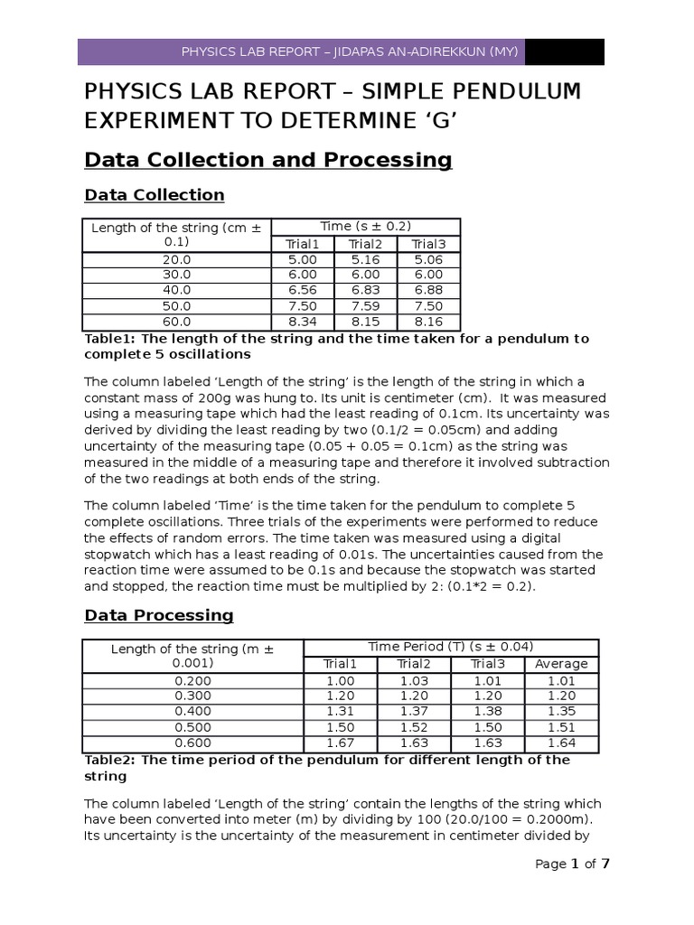 PHYSICS LAB REPORT SIMPLE PENDULUM