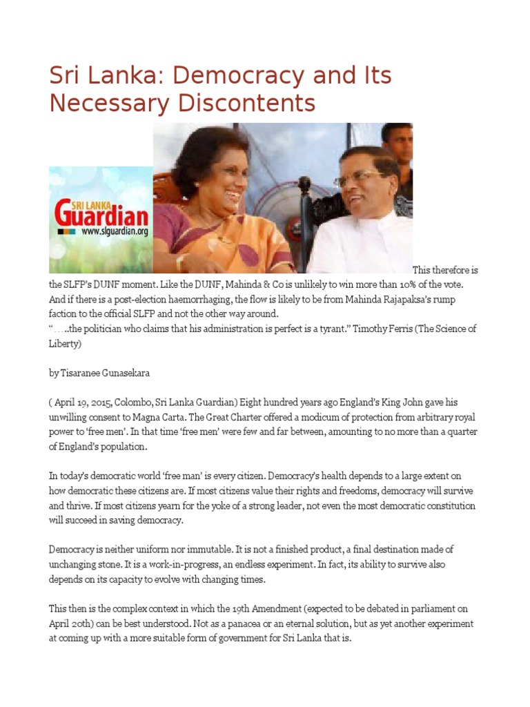 of the ruling power. Lankan democracy can be safe only so long as we the people are committed to it, value