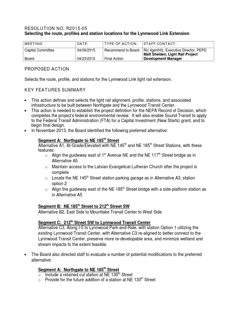 Motion No. M2013-96: Identified the preferred light rail route and station locations for the Lynnwood Link Extension Final Environmental Impact Statement. Motion No. M2012-17: Identified the light rail route and station alternatives to study in detail in the Lynnwood Link Extension Draft Environmental Impact Statement.