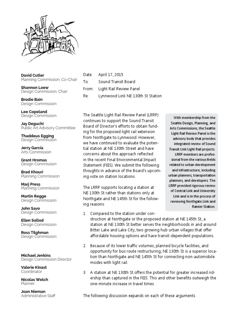 The Seattle Light Rail Review Panel (LRRP) continues to support the Sound Transit Board of Director’s efforts to obtain fund-ing for the proposed light rail extension from Northgate to Lynnwood. However, we have continued to evaluate the poten-tial station at NE 130th Street and have