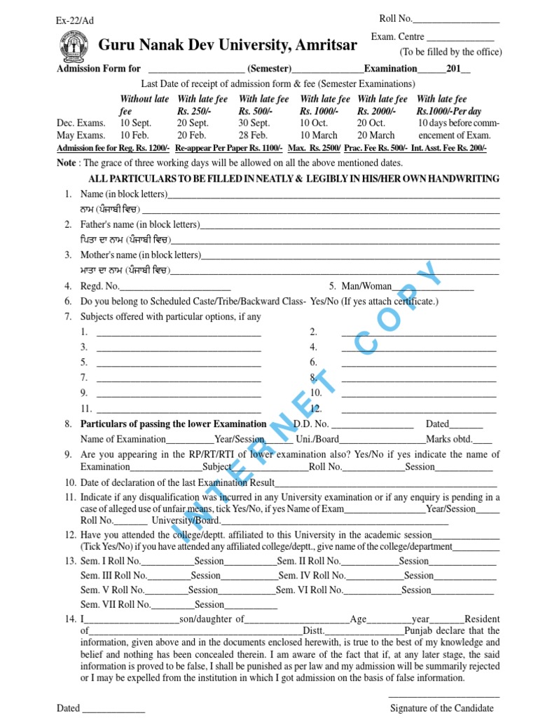 Admission Form for ____________________ (Semester)_______________Examination______201__