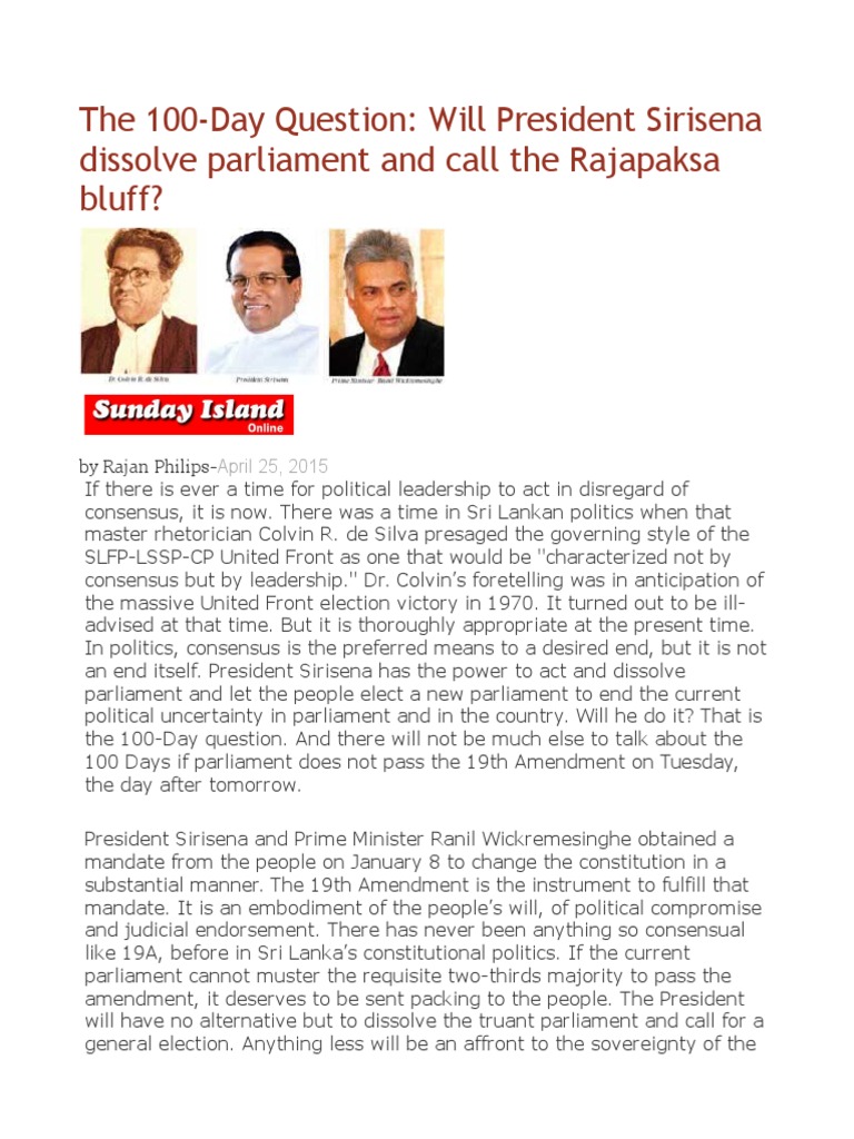 If there is ever a time for political leadership to act in disregard of consensus, it is now. There was a time in Sri Lankan politics when that master rhetorician Colvin R. de Silva presaged the governing style of the SLFP-LSSP-CP United Front as one that would be "characterized not by consensus but by leadership." Dr. Colvins foretelling was in anticipation of the massive United Front election victory in 1970. It turned out to be illadvised at that time. But it is thoroughly appropriate at the present time. In politics, consensus is the preferred means to a desired end, but it is not an end itself. President Sirisena has the power to act and dissolve parliament and let the people elect a new parliament to end the current political uncertainty in parliament and in the country. Will he do it? That is the 100-Day question. And there will not be much else to talk about the 100 Days if parliament does not pass the 19th Amendment on Tuesday, the day after tomorrow. President Sirisena and Prime Minister Ranil Wickremesinghe obtained a mandate from the people on January 8 to change the constitution in a substantial manner. The 19th Amendment is the instrument to fulfill that mandate. It is an embodiment of the peoples will, of political compromise and judicial endorsement. There has never been anything so consensual like 19A, before in Sri Lankas constitutional politics. If the current parliament cannot muster the requisite two-thirds majority to pass the amendment, it deserves to be sent packing to the people. The President will have no alternative but to dissolve the truant parliament and call for a general election. Anything less will be an affront to the sovereignty of the