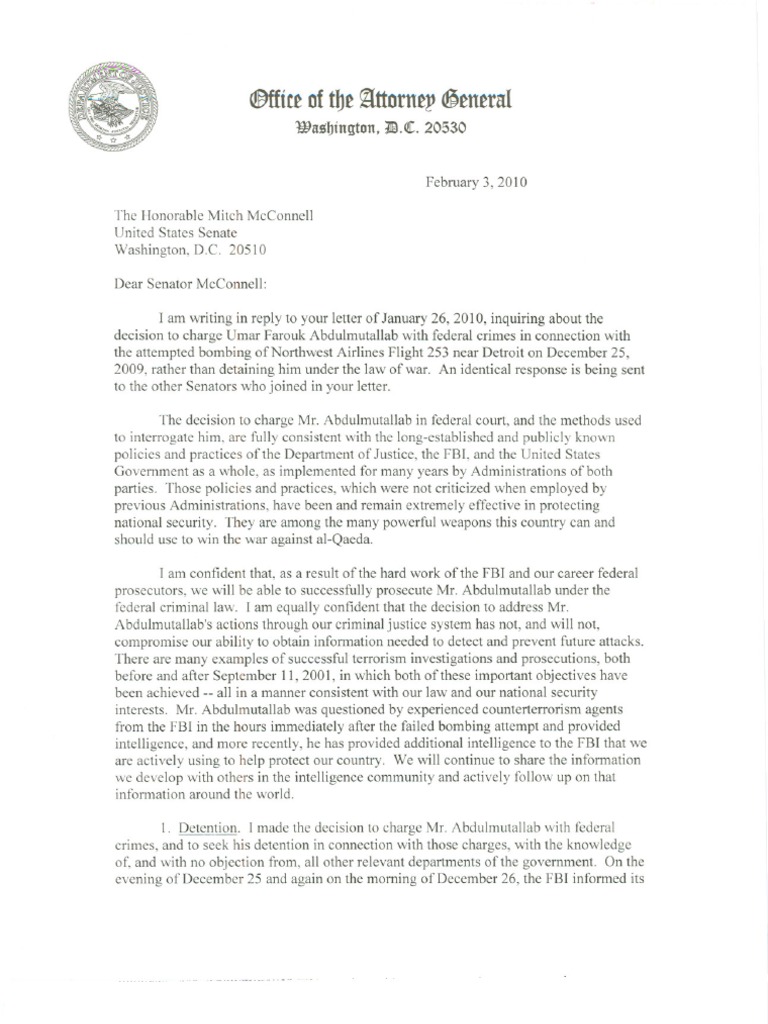 IamwritinginreplytoyourletterofJanuary26,2010,inquiringaboutthedecisiontochargeUmarFaroukAbdulmutallabwithfederalcrimesinconnectionwiththeattemptedbombingofNorthwestAirlinesFlight253nearDetroitonDecember25,2009,ratherthandetaininghimunderthelawofwar.AnidenticalresponseisbeingsenttotheotherSenatorswhojoinedinyourletter.