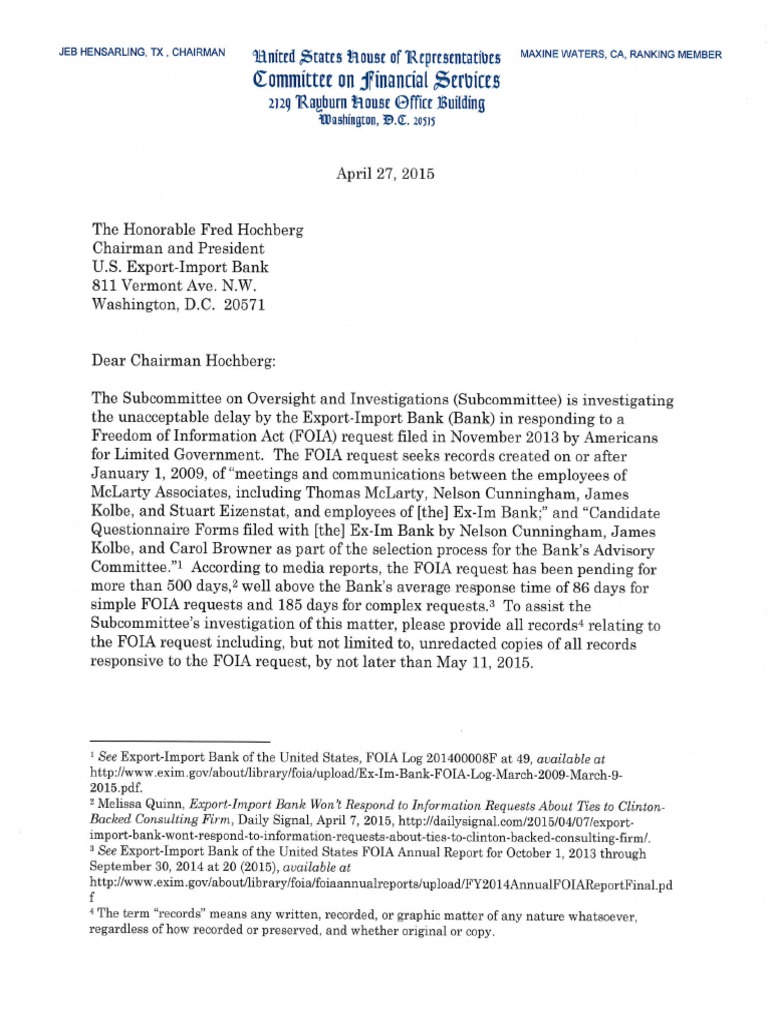 Rep. Sean Duffy, R-Wis., chairman of the House Financial Services Subcommittee on Oversight and Investigations, sent a letter to Export-Import Bank Chairman Fred Hochberg on the status of a two-year old Freedom of Information Act request.