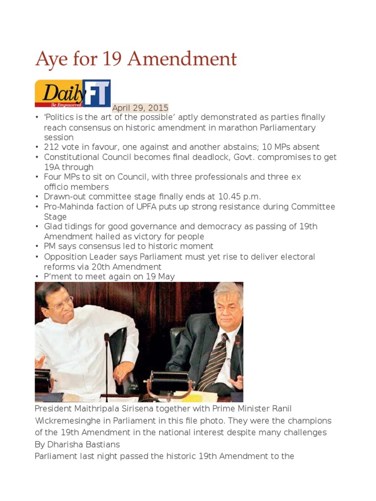 Eight amendments proposed by the SLFP were thrashed out by the sixmember committee appointed by the President on 27 April and whittled