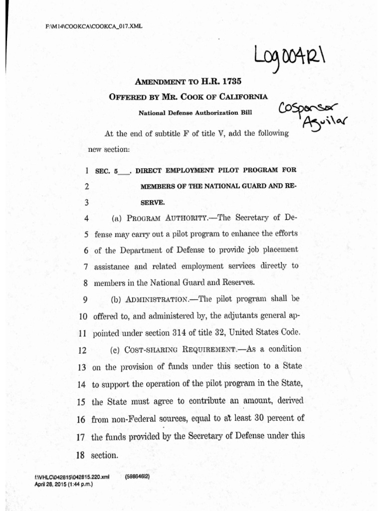 California Representatives Pete Aguilar (D, CA-31) and Colonel Paul Cook (R, CA-08) introduced legislation to help states create pilot programs to put veterans back to work. Their amendment to the National Defense Authorization Act, which outlines the nation’s defense priorities, enables the Department of Defense to fund job placement programs for members of the National Guard and Reserve, similar to the ‘Work for Warriors’ program in California.