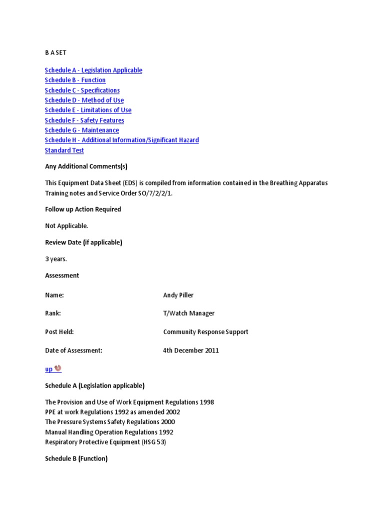 This Equipment Data Sheet (EDS) is compiled from information contained in the Breathing Apparatus