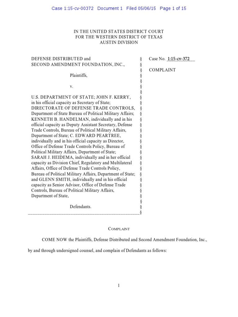 Defense Distributed v. U.S. Dep't of State - Complaint