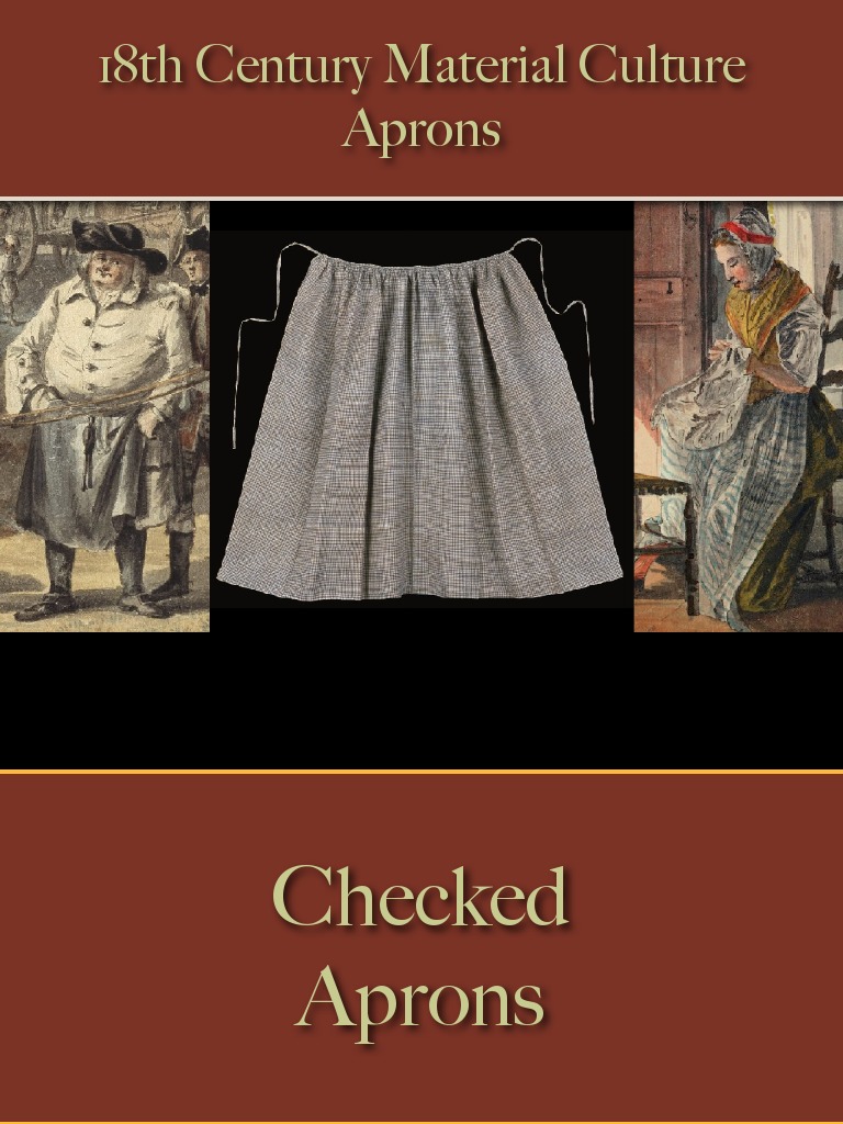 This document contains images and descriptions of 18th century aprons from England, America, and France. The majority are checked or embroidered linen aprons, but there are also examples of …