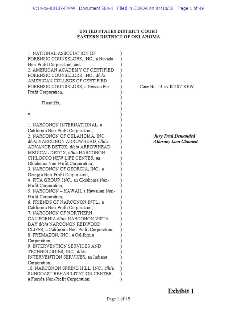 1.NATIONAL ASSOCIATION OFFORENSIC COUNSELORS, INC., a Nevada Non-Profit Corporation, and 2.AMERICAN ACADEMY OF CERTIFIEDFORENSIC COUNSELORS, INC., d/b/a AMERICAN COLLEGE OF CERTIFIED FORENSIC COUNSELORS, a Nevada For-Profit Corporation, Plaintiffs, v. 1.NARCONON INTERNATIONAL, aCalifornia Non-Profit Corporation; 2.NARCONON OF OKLAHOMA, INC.d/b/a NARCONON ARROWHEAD, d/b/a ADVANCE DETOX, d/b/a ARROWHEAD MEDICAL DETOX, d/b/a NARCONON CHILOCCO NEW LIFE CENTER, an Oklahoma Non-Profit Corporation; 3.NARCONON OF GEORGIA, INC., aGeorgia Non-Profit Corporation; 4.PITA GROUP, INC., an Oklahoma Non-Profit Corporation; 5.NARCONON – HAWAII, a Hawaiian Non-Profit Corporation; 6.FRIENDS OF NARCONON INTL., aCalifornia Non-Profit Corporation; 7.NARCONON OF NORTHERNCALIFORNIA d/b/a NARCONON VISTA BAY d/b/a NARCONON REDWOOD CLIFFS, a California Non-Profit Corporation; 8.PREMAZON, INC., a CaliforniaCorporation; 9.INTERVENTION SERVICES ANDTECHNOLOGIES, INC., d/b/a INTERVENTION SERVICES, an Indiana Corporation; 10.NARCONON SPRING HILL, INC., d/b/aSUNCOAST REHABILITATION CENTER, a Florida Non-Profit Corporation; ))))))))))))))))))))))))))))))))))))))))))Case No. 14-cv-00187-KEW