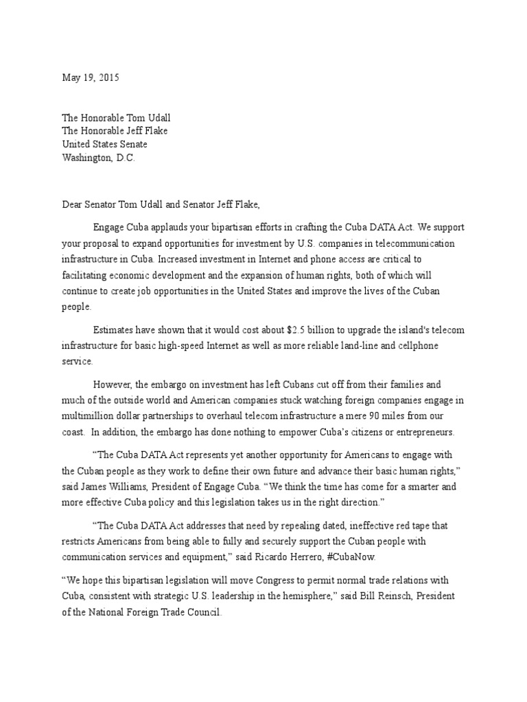 May 19, 2015 The Honorable Tom Udall The Honorable Jeff Flake United States Senate Washington, D.C. Dear Senator Tom Udall and Senator Jeff Flake, Engage Cuba applauds your bipartisan efforts in crafting the Cuba DATA Act. We support your proposal to expand opportunities for investment by U.S. companies in telecommunication infrastructure in Cuba. Increased investment in Internet and phone access are critical to facilitating economic development and the expansion of human rights, both of which will continue to create job opportunities in the United States and improve the lives of the Cuban people. Estimates have shown that it would cost about $2.5 billion to upgrade the island's telecom infrastructure for basic high-speed Internet as well as more reliable land-line and cellphone service. However, the embargo on investment has left Cubans cut off from their families and much of the outside world and American companies stuck watching foreign companies engage in multimillion dollar partnerships to overhaul telecom infrastructure a mere 90 miles from our coast. In addition, the embargo has done nothing to empower Cuba’s citizens or entrepreneurs. “The Cuba DATA Act represents yet another opportunity for Americans to engage with the Cuban people as they work to define their own future and advance their basic human rights,” said James Williams, President of Engage Cuba. “We think the time has come for a smarter and more effective Cuba policy and this legislation takes us in the right direction.” “The Cuba DATA Act addresses that need by repealing dated, ineffective red tape that restricts Americans from being able to fully and securely support the Cuban people with communication services and equipment,” said Ricardo Herrero, #CubaNow. “We hope this bipartisan legislation will move Congress to permit normal trade relations with Cuba, consistent with strategic U.S. leadership in the hemisphere,” said Bill Reinsch, President of the National Foreign Trade Council.
