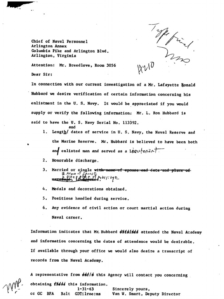 In 1963, the FDA requests and receives a summary of L. Ron Hubbard's military record from the US Navy