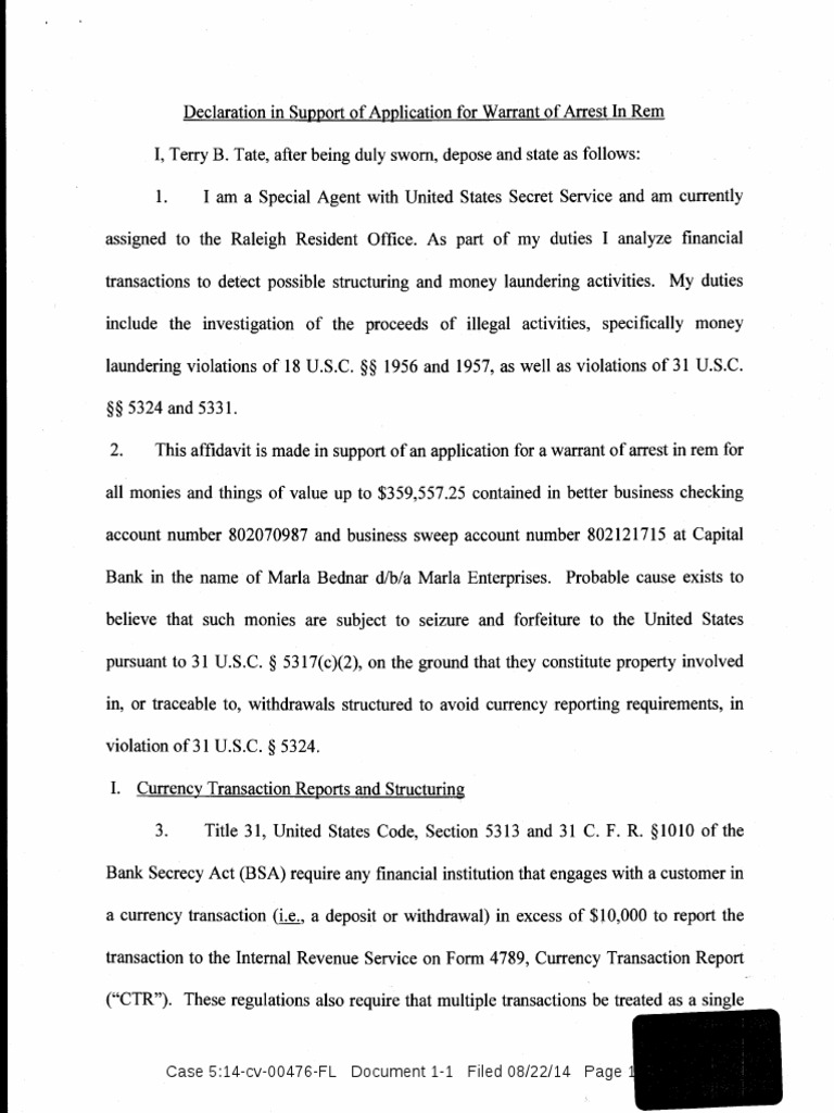 Marla Bednar d/b/a Marla Enterprises. Probable cause exists to believe that such monies are subject to seizure and forfeiture to the United States pursuant to
