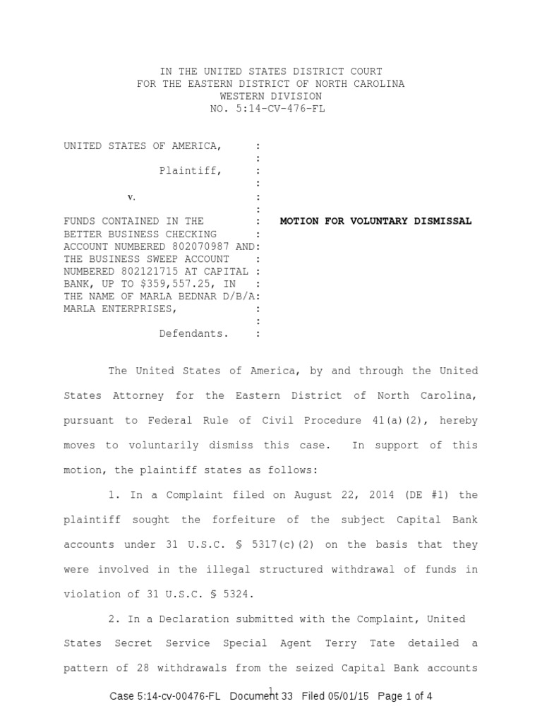 BETTER BUSINESS CHECKING : ACCOUNT NUMBERED 802070987 AND: THE BUSINESS SWEEP ACCOUNT : NUMBERED 802121715 AT CAPITAL : BANK, UP TO $359,557.25, IN : THE NAME OF MARLA BEDNAR D/B/A: MARLA ENTERPRISES, : : Defendants. : The United States of America, by and through the United States Attorney for the Eastern District of North Carolina, pursuant to Federal Rule of Civil Procedure 41(a)(2), hereby moves to voluntarily dismiss this case. In support of this motion, the plaintiff states as follows: 1. In a Complaint filed on August 22, 2014 (DE #1) the plaintiff sought the forfeiture of the subject Capital Bank accounts under 31 U.S.C. § 5317(c)(2) on the basis that they were involved in the illegal structured withdrawal of funds in violation of 31 U.S.C. § 5324. 2. In a Declaration submitted with the Complaint, United States Secret Service Special Agent Terry Tate detailed a pattern of 28 withdrawals fromthe seized Capital Bank accounts