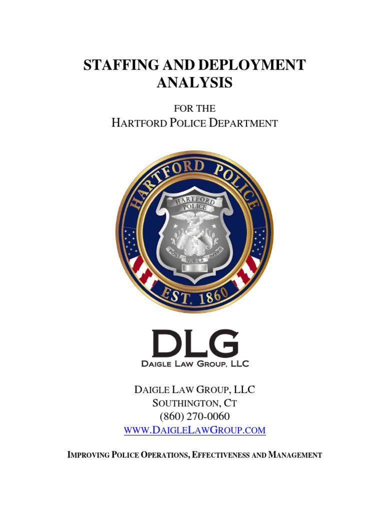 The Hartford Police Department (HPD) and the City of Hartford contracted with the Daigle Law Group, LLC (DLG) to conduct a staffing and deployment study of the Hartford Police Department. Staffing and deployment of police personnel are ongoing challenges that have become increasingly complex for all police departments in recent years. The challenges for determining and maintaining adequate staffing include: supply of and demand for quality police officers in a time of increased attrition, expanding law enforcement responsibility, and limited resources. The process for determining the appropriate number of police officers required to ensure proper and efficient service to the community is often referred to as “rightsizing.” A sub-set of “rightsizing” is the determination of whether the staffing levels are efficiently and effectively deployed in accordance with community expectations. This process includes consideration of ever-changing crime trends, varying calls for service, and unplanned or unexpected events. Therefore, in order to meet public expectations, a police department must not only be adequately staffed, but also have the flexibility to adjust deployment strategies in order to deliver police services in a cost effective and efficient manner consistent with contemporary standards. This study is designed to assess and determine the number of officers required to sufficiently staff the Hartford Police Department and also to assess the efficiency of the present deployment strategies. There is, however, a fundamental difference between how many officers a community “wants” and how many officers a community “needs.” It is our belief that recognizing this difference properly frames a discussion about “want” and ability to properly fund this. This analysis varies considerably given that every agency has a different familiarity with proactive planning. The staffing analysis is also affected by a department’s organizational needs, capacity, used time, and available data. Few agencies are able to conclusively demonstrate through a workload analysis alone that they are understaffed. When evaluating a staffing analysis, it is important to understand that context of operation matters. In comparison, municipalities must analyze the operational realities of the organization versus the operational desires of the police department and the community it serves. a.