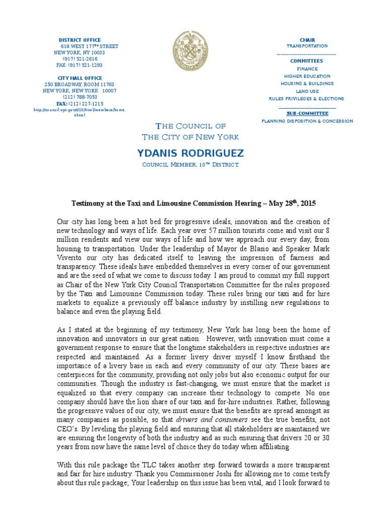 Our city has long been a hot bed for progressive ideals, innovation and the creation of new technology and ways of life. Each year over 57 million tourists come and visit our 8million residents and view our ways of life and how we approach our every day, fromhousing to transportation. Under the leadership of Mayor de lasio and !pea"er Mar" #iverito our city has dedicated itself to leaving the impression of fairness andtransparency. $hese ideals have embedded themselves in every corner of our governmentand are the seed of what we come to discuss today. % am proud to commit my full supportas &hair of the 'ew (or" &ity &ouncil $ransportation &ommittee for the rules proposed by the $a)i and *imousine &ommission today. $hese rules bring our ta)i and for hiremar"ets to e+ualie a previously off balance industry by instilling new regulations to balance and even the playing field. -s % stated at the beginning of my testimony, 'ew (or" has long been the home of innovation and innovators in our great nation. owever, with innovation must come agovernment response to ensure that the longtime sta"eholders in respective industries arerespected and maintained. -s a former livery driver myself % "now firsthand theimportance of a livery base in each and every community of our city. $hese bases arecenterpieces for the community, providing not only /obs but also economic output for our communities. $hough the industry is fast0changing, we must ensure that the mar"et ise+ualied so that every company can increase their technology to compete. 'o onecompany should have the lion share of our ta)i and for0hire industries. 1ather, followingthe progressive values of our city, we must ensure that the benefits are spread amongst asmany companies as possible, so that