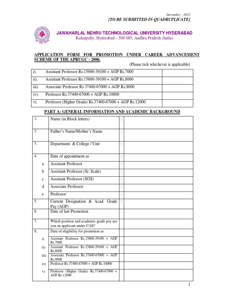 APPLICATION FORM FOR PROMOTION UNDER CAREER ADVANCEMENT