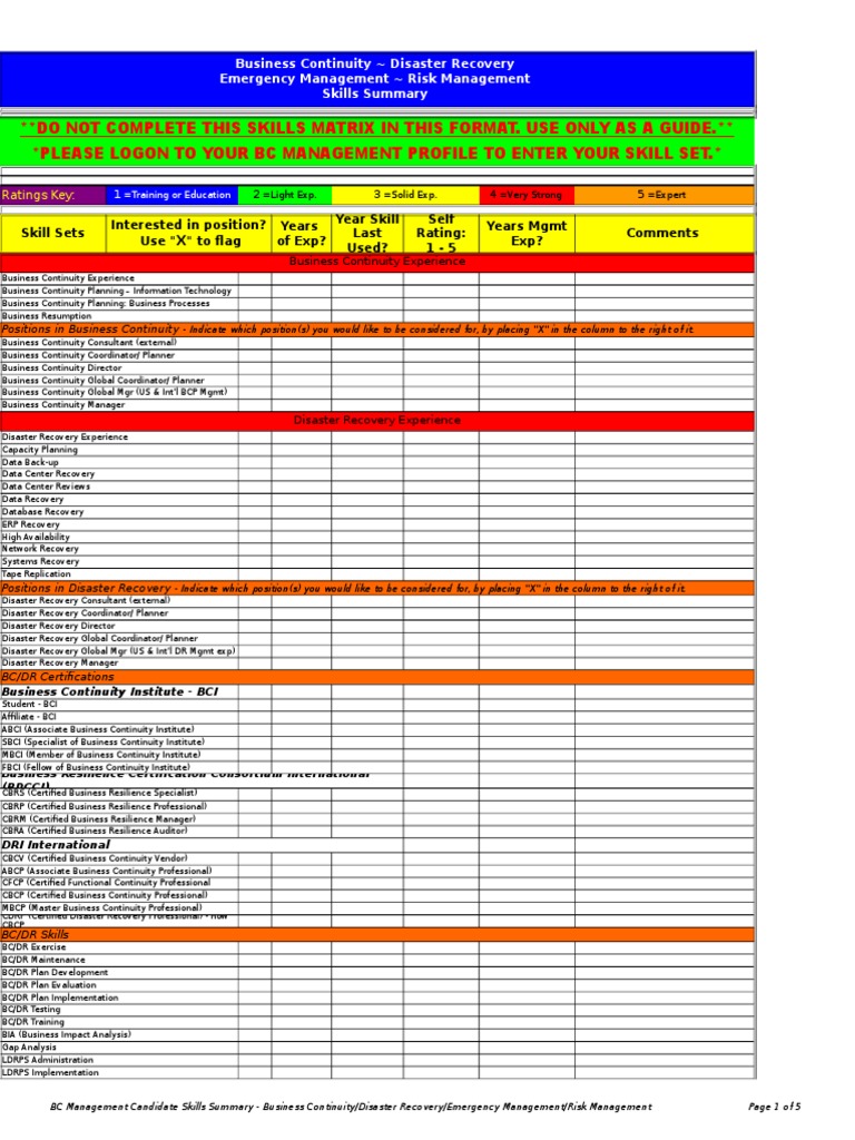 BC Management Candidate Skills Summary - Business Continuity/Disaster Recovery/Emergency Management/Risk Management