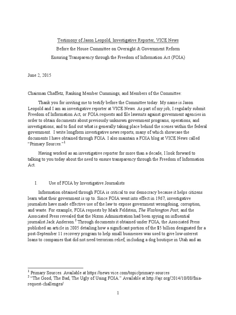 On June 2, 2015 VICE News investigative reporter Jason Leopold testified about the Freedom of Information Act before the House Committee on Oversight and Government reform.