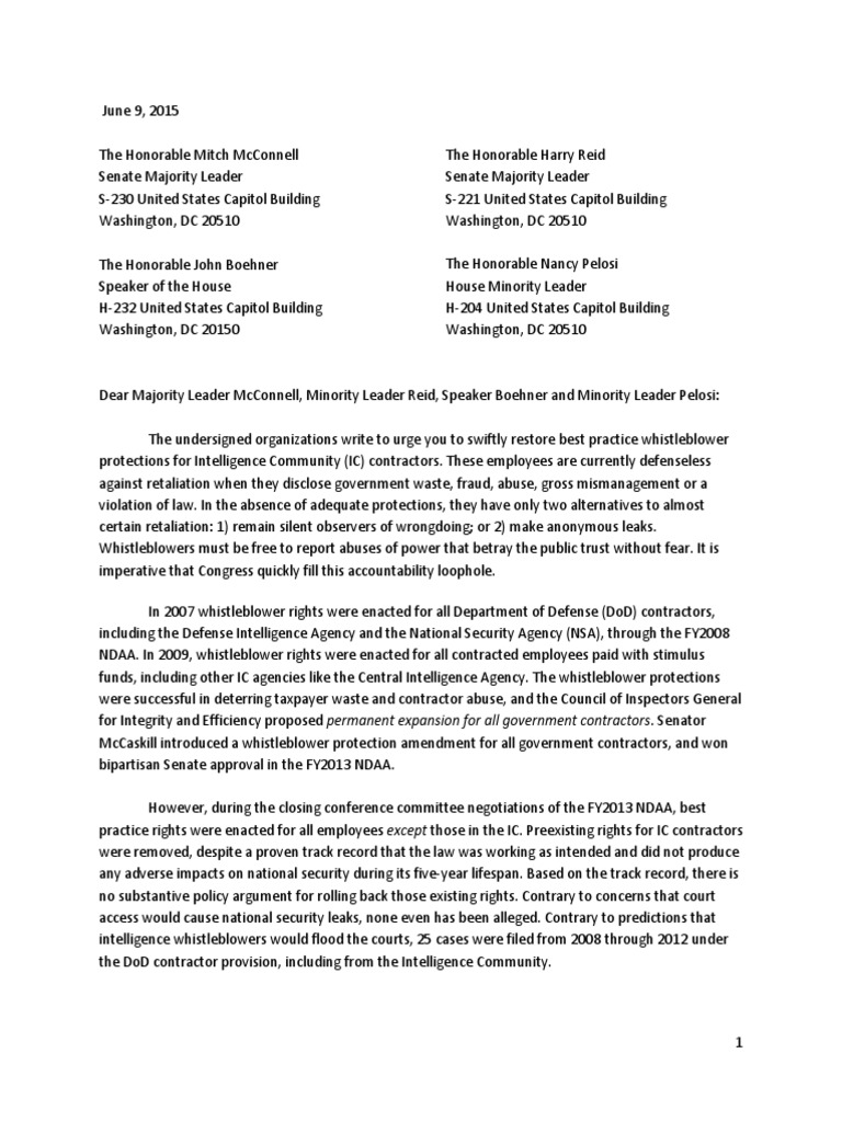 Letter Urging Whistleblower Protections For IC Contractors