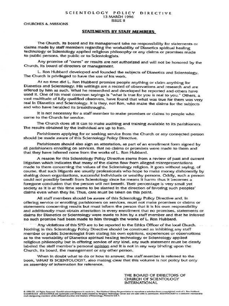 Scientology Policy Directive of 13 March 1996 Issue II. Entitled Statements by Staff Members