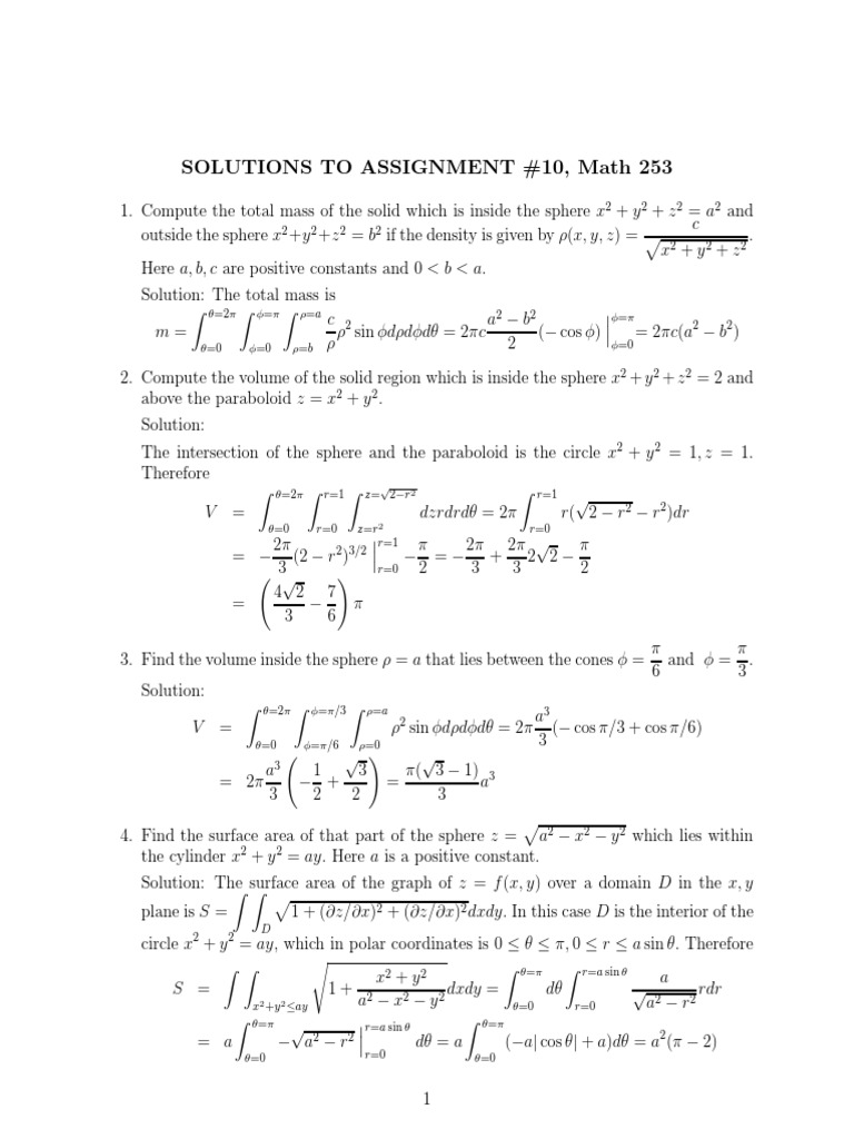 1. Compute the total mass of the solid which is inside the sphere x2 + y 2 + z 2 = a2 and