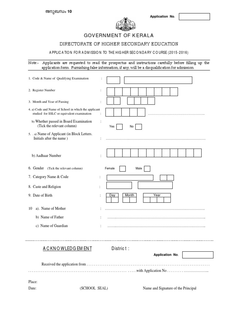 APPLICATION FOR ADMISSION TO THE HIGHER SECONDARY COURSE (2015-2016)