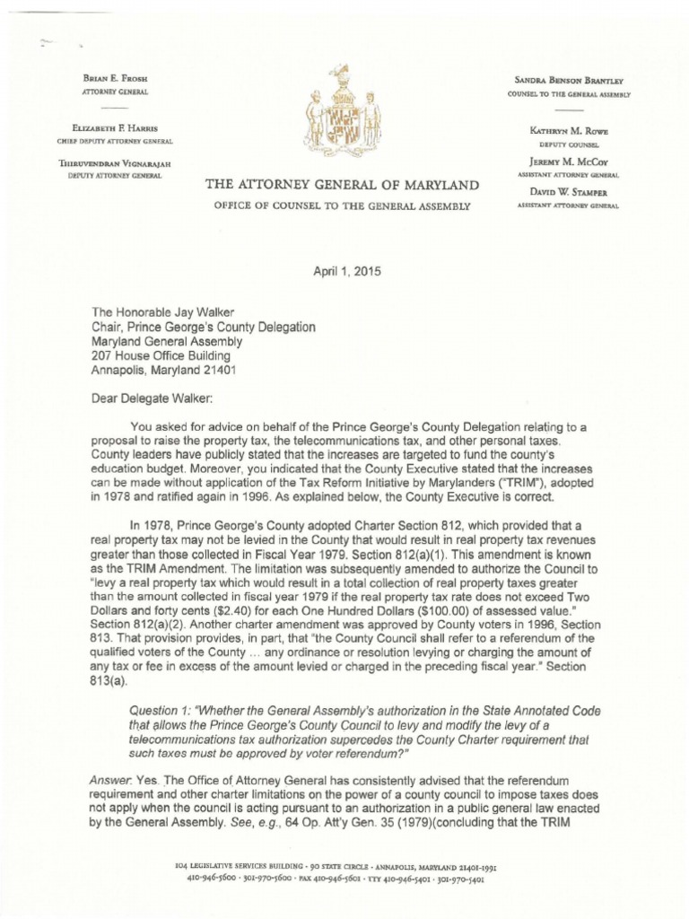 proposal to raise the property tax, the telecommunications tax, and other personal taxes. County leaders have publicly stated that the increases are targeted to fund the county's education budget. Moreover, you indicated that the County Executive stated that the increases can be made without application of the Tax Reform Initiative by Marylanders ( TRIM ), adopted