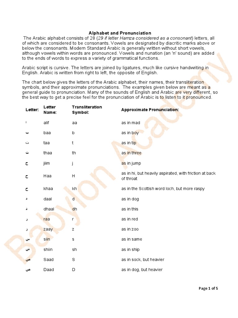 The chart below gives the letters of the Arabic alphabet, their names, their transliteration