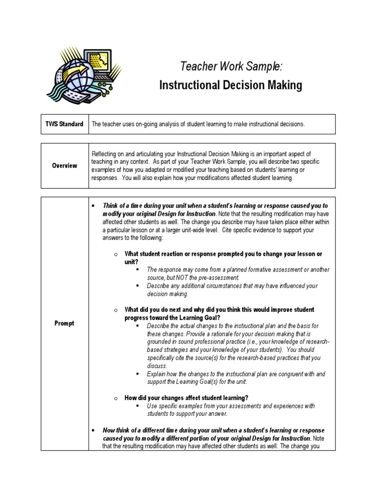 teaching in any context. As part of your Teacher Work Sample, you will describe two specific