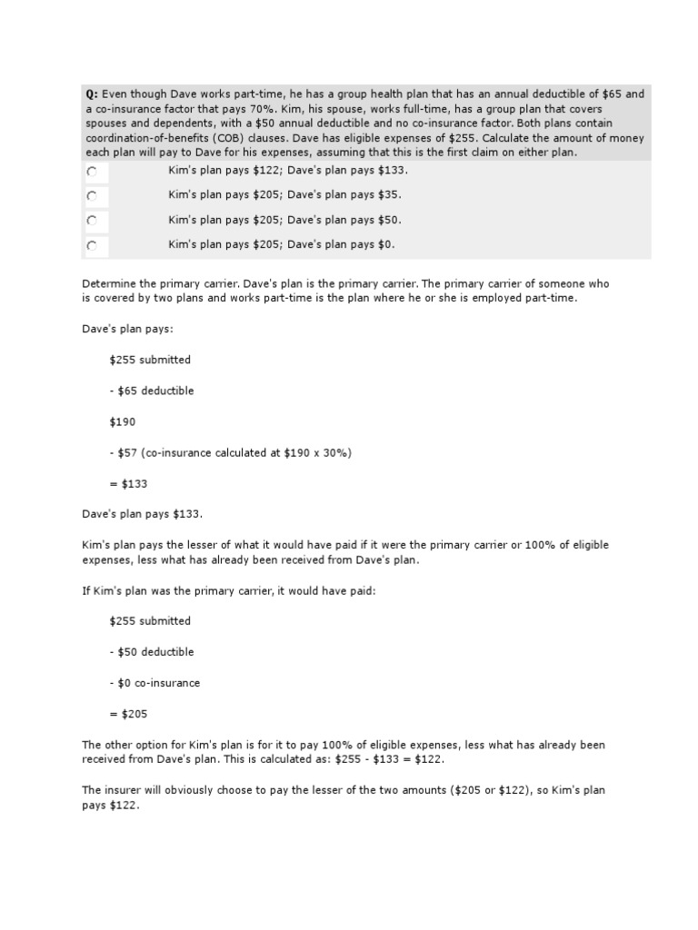 coordination-of-benefits (COB) clauses. Dave has eligible expenses of $255. Calculate the amount of money