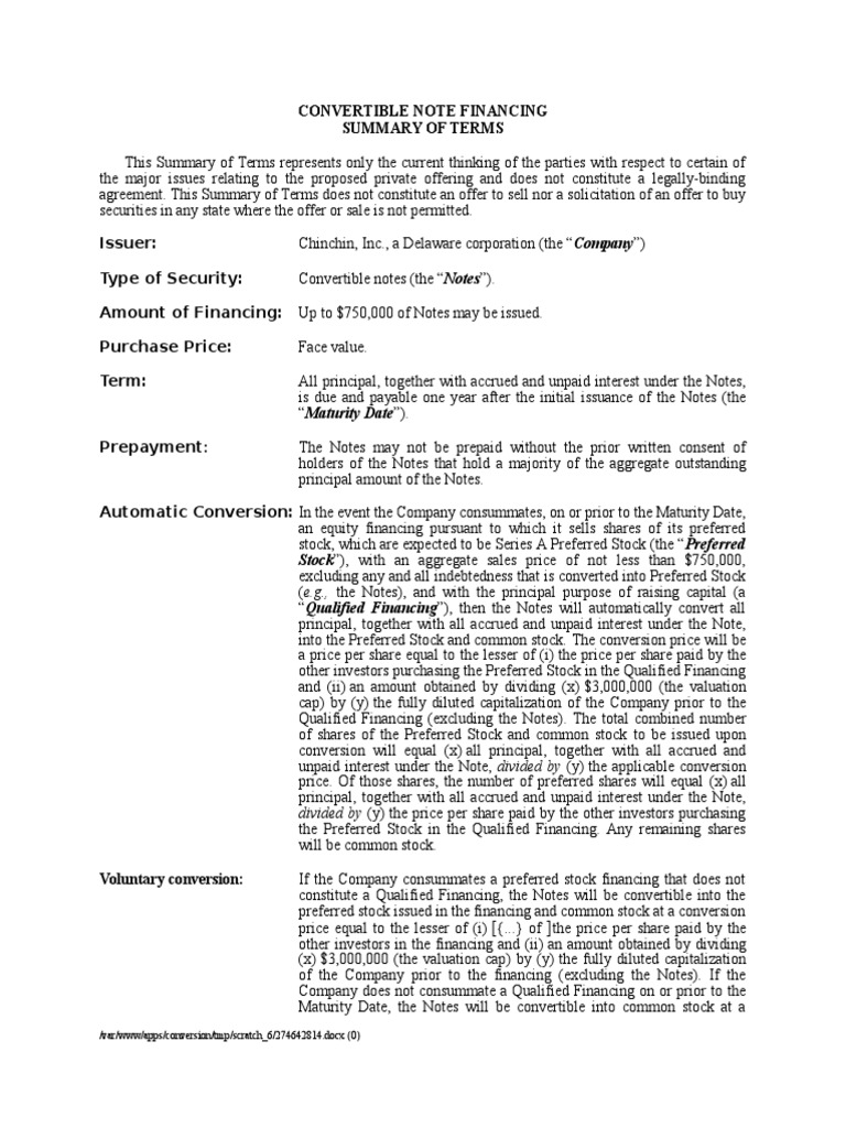 CONVERTIBLE NOTE FINANCING