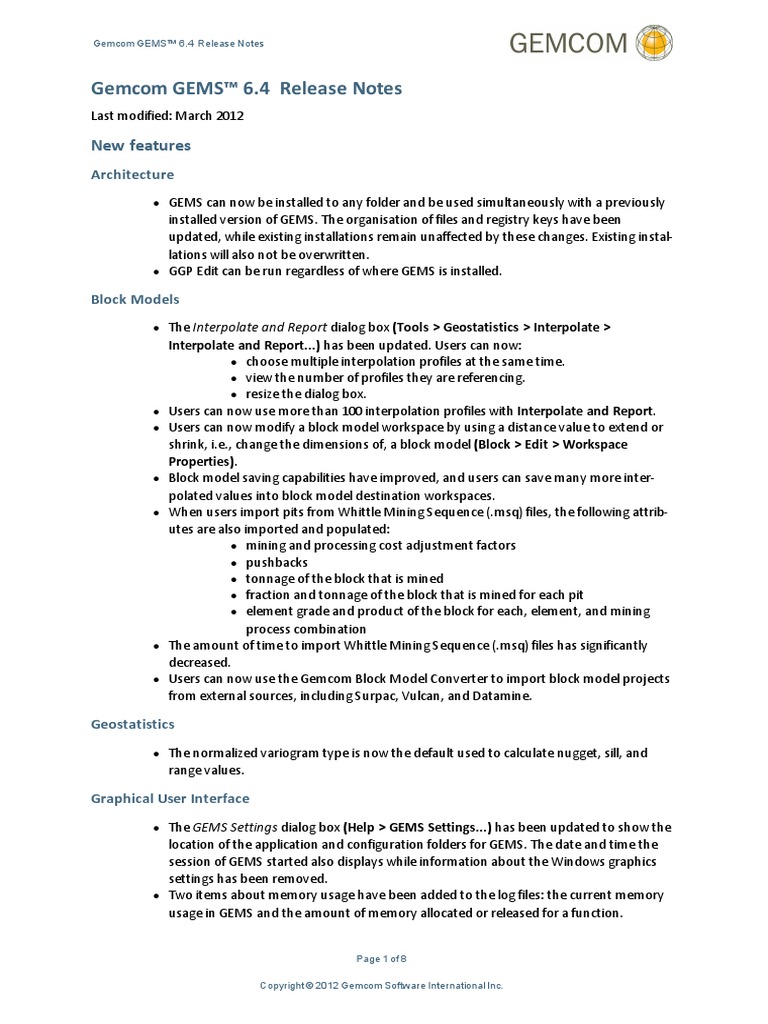 GemcomGEMS 6.4 Release Notes
