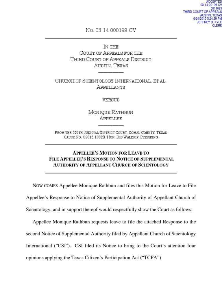 Appellee Monique Rathbun and files this Motion for Leave to File Appellee’s Response to Notice of Supplemental Authority of Appellant Church of Scientology, and in support thereof would respectfully show the Court as follows: Appellee Monique Rathbun requests leave to file the attached Response to the second Notice of Supplemental Authority filed by Appellant Church of Scientology International (“CSI”). CSI filed its Notice to bring to the Court’s attention four opinions applying the Texas Citizen’s Participation Act (“TCPA”)