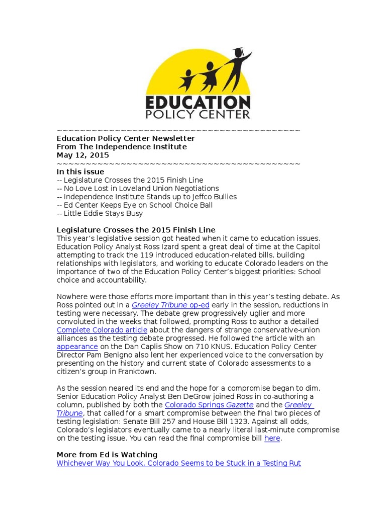 From The Independence Institute May 12, 2015 ~~~~~~~~~~~~~~~~~~~~~~~~~~~~~~~~~~~~~~~~~~ In this issue -- Legislature Crosses the 2015 Finish Line -- No Love Lost in Loveland Union Negotiations -- Independence Institute Stands up to Jeffco Bullies -- Ed Center Keeps Eye on School Choice Ball -- Little Eddie Stays Busy Legislature Crosses the 2015 Finish Line This years legislative session got heated when it came to education issues. Education Policy Analyst Ross Izard spent a great deal of time at the Capitol attempting to track the 119 introduced education-related bills, building relationships with legislators, and working to educate Colorado leaders on the importance of two of the Education Policy Centers biggest priorities: School choice and accountability. Nowhere were those efforts more important than in this years testing debate. As Ross pointed out in a Greeley Tribune op-ed early in the session, reductions in testing were necessary. The debate grew progressively uglier and more convoluted in the weeks that followed, prompting Ross to author a detailed Complete Colorado article about the dangers of strange conservative-union alliances as the testing debate progressed. He followed the article with an appearance on the Dan Caplis Show on 710 KNUS. Education Policy Center Director Pam Benigno also lent her experienced voice to the conversation by presenting on the history and current state of Colorado assessments to a citizens group in Franktown. As the session neared its end and the hope for a compromise began to dim, Senior Education Policy Analyst Ben DeGrow joined Ross in co-authoring a column, published by both the Colorado Springs Gazette and the Greeley Tribune, that called for a smart compromise between the final two pieces of testing legislation: Senate Bill 257 and House Bill 1323. Against all odds, Colorados legislators eventually came to a nearly literal last-minute compromise on the testing issue. You can read the final compromise bill here. More from Ed is Watching Whichever Way You Look, Colorado Seems to be Stuck in a Testing Rut