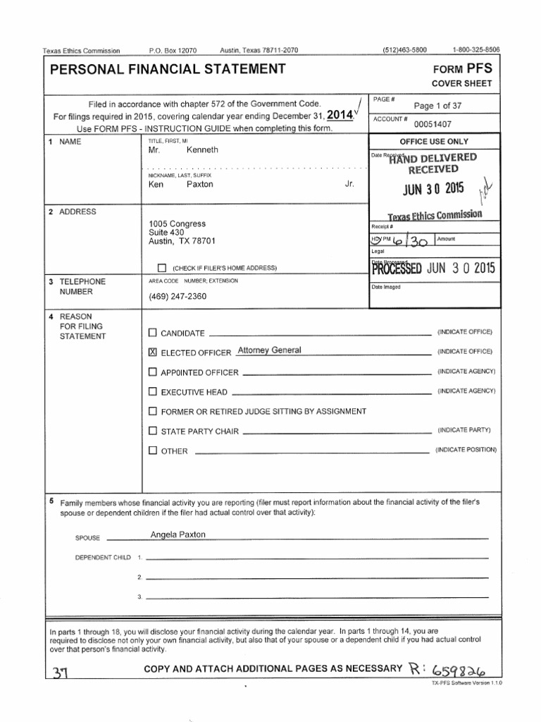 W. Kenneth Paxton 2015 Personal Financial Disclosure Form