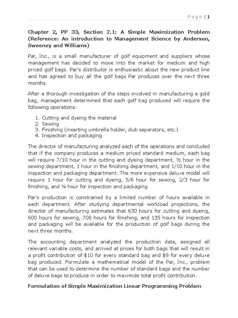 bag produced. Formulate a mathematical model of the Par, Inc., problem