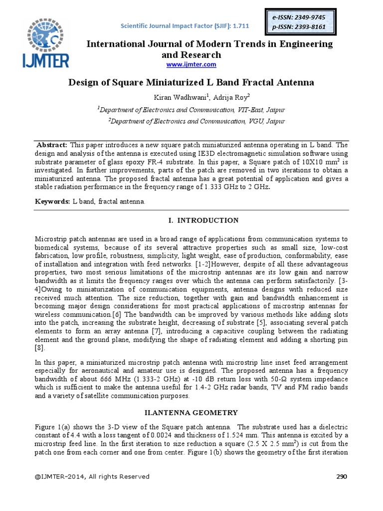 substrate parameter of glass epoxy FR-4 substrate. In this paper, a Square patch of 10X10 mm2 is