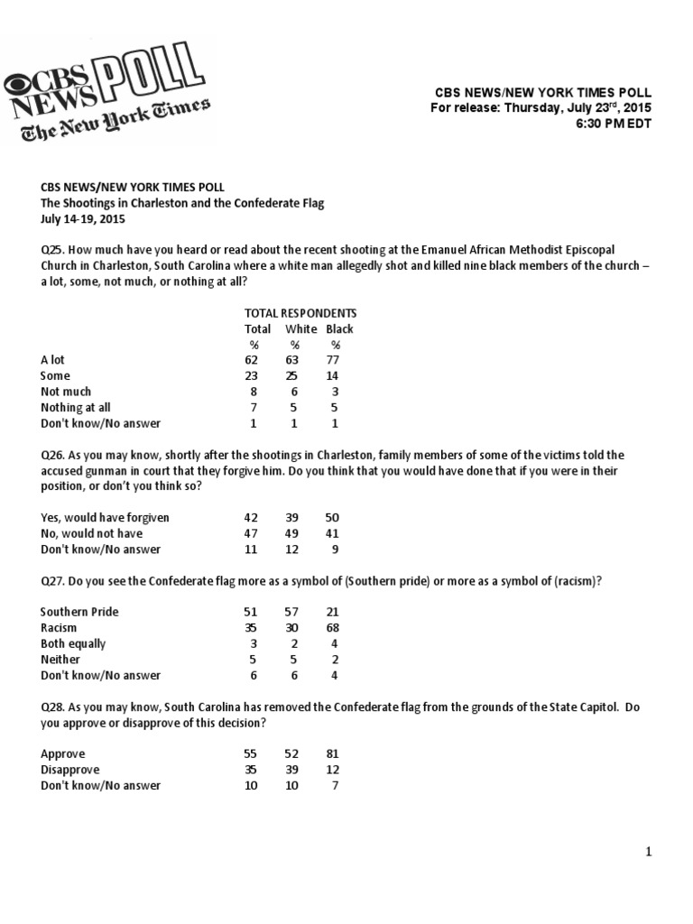 Q25. How much have you heard or read about the recent shooting at the Emanuel African Methodist Episcopal Church in Charleston, South Carolina where a white man allegedly shot and killed nine black members of the church – a lot, some, not much, or nothing at all? TOTAL RESPONDENTS TotalWhiteBlack % % % A lot626377 Some232514 Not much 8 6 3 Nothing at all 7 5 5 Don't know/No answer 1 1 1 Q26. As you may know, shortly after the shootings in Charleston, family members of some of the victims told the accused gunman in court that they forgive him. Do you think that you would have done that if you were in their position, or don’t you think so? Yes, would have forgiven423950 No, would not have474941 Don't know/No answer1112 9 Q27. Do you see the Confederate flag more as a symbol of (Southern pride) or more as a symbol of (racism)? Southern Pride515721 Racism353068 Both equally 3 2 4 Neither 5 5 2 Don't know/No answer 6 6 4 Q28. As you may know, South Carolina has removed the Confederate flag from the grounds of the State Capitol. Do you approve or disapprove of this decision? Approve555281 Disapprove353912 Don't know/No answer1010 7