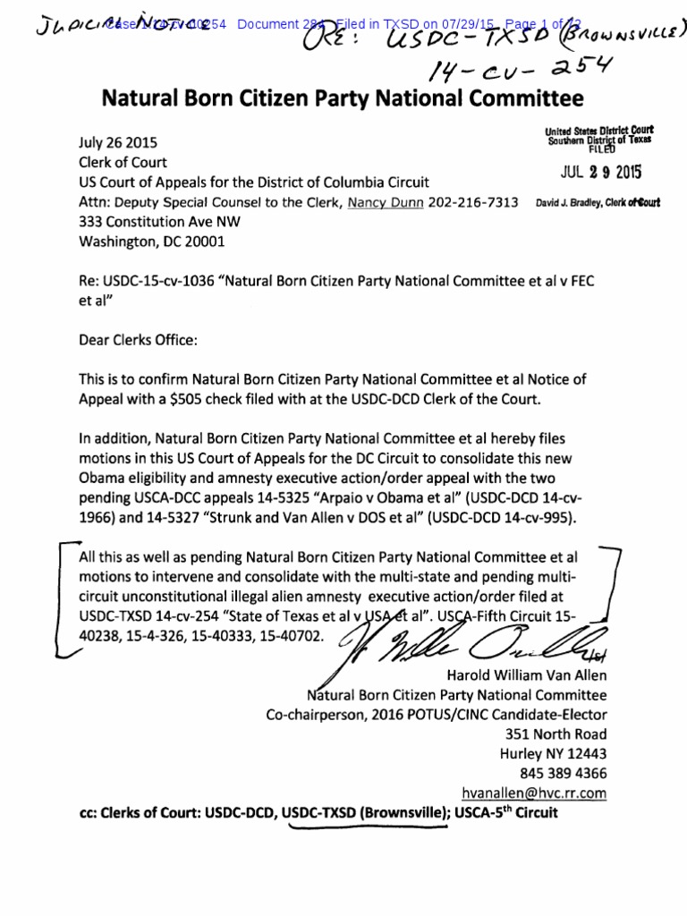 USDC TXSD 14-Cv-254 Doc 284 Judicial Notice Natural Born Citizen Party National Committee USCA DCC NOA USDC-DCD 15-Cv-1036 Consolidation