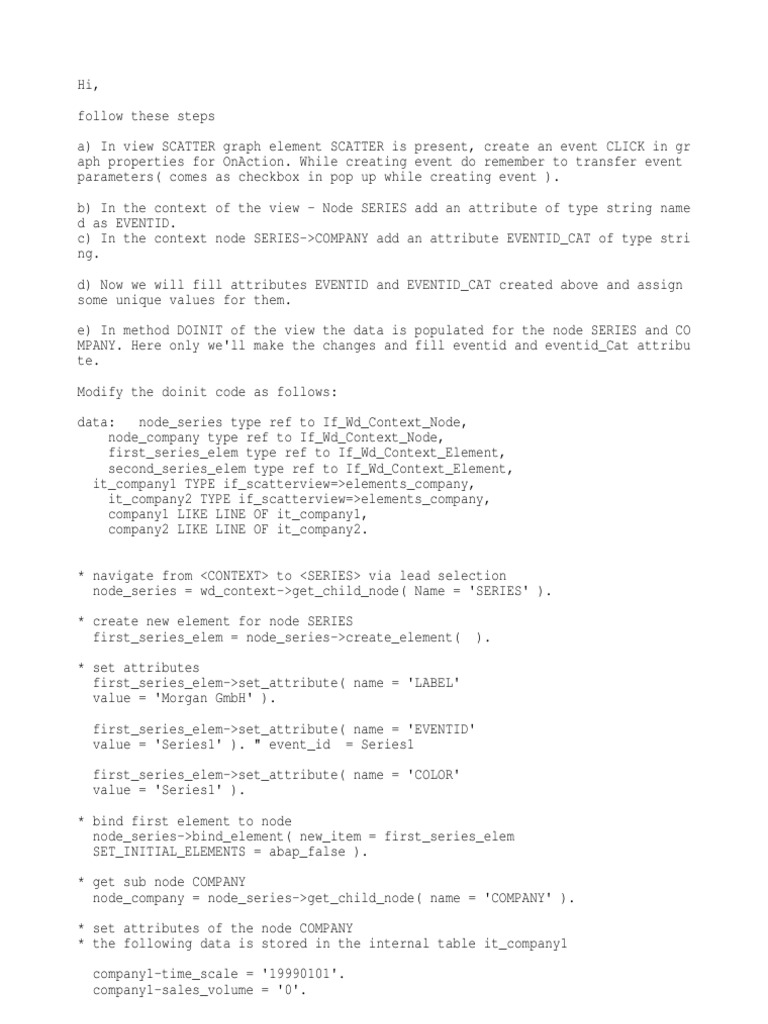 In view SCATTER graph element SCATTER is present, create an event CLICK in gr aph properties for OnAction. In the context of the view - Node SERIES add an attribute of type string name d as eventid. In view method doinit of the view the data is populated for the nodes SERIES and CO MPANY. Here only we'll make the changes and fill EVENTID and EVENTID_CAT attribu te.