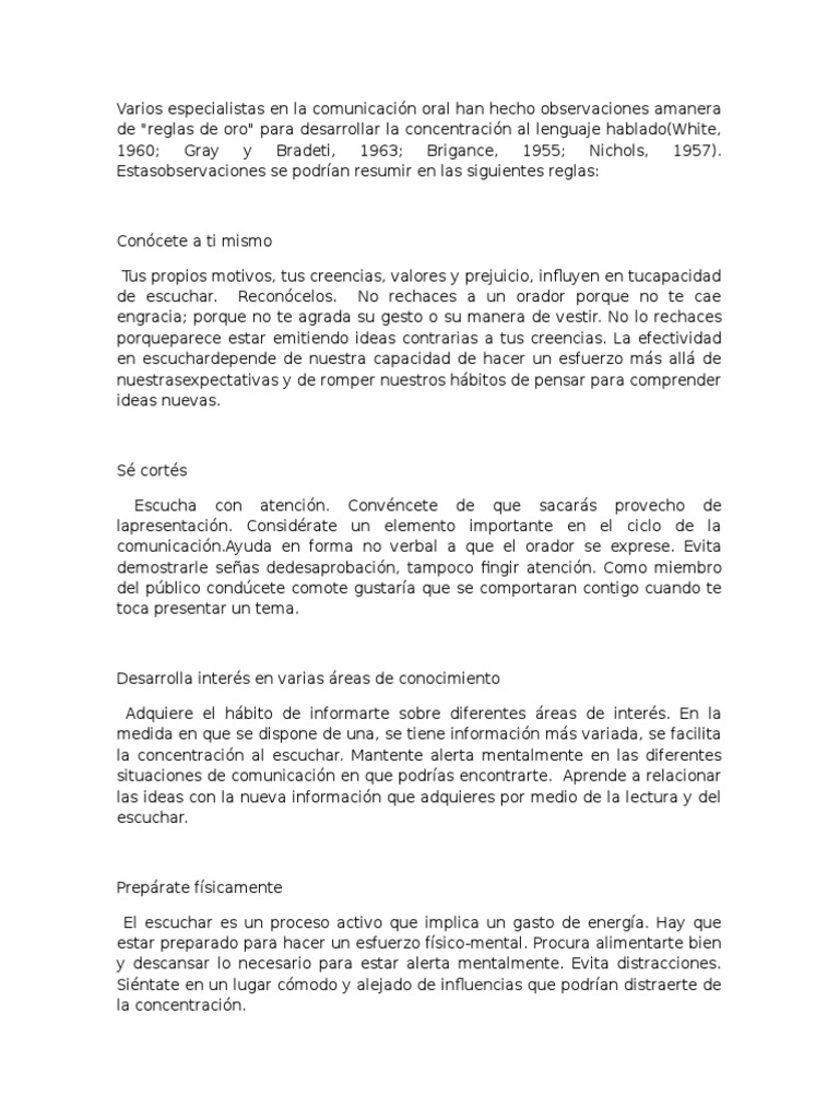 de "reglas de oro" para desarrollar la concentración al lenguaje hablado(White,