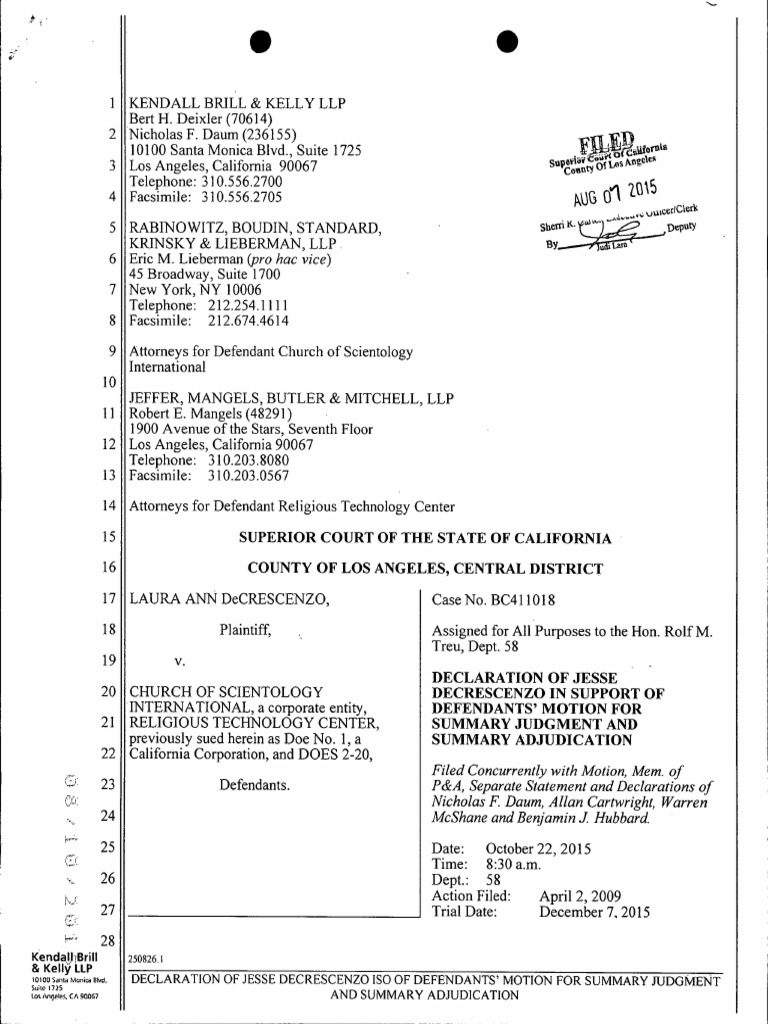 Jesse DeCrescenzo submits a declaration for Scientology's motion for summary judgment